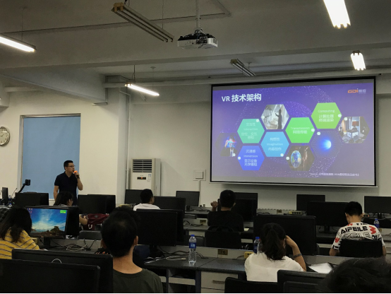 上海曼恒数字技术股份有限公司北京分公司高杰总经理,在会上向参赛各队伍老师及学员分享目前教育行业中5G+VR技术结合以及教学应用和发展趋势。并详细介绍了VR产品体系的应用领域,与老师及学员们共同探讨了VR技术在教学中的应用场景,建立行业内学习及学术沟通桥梁。