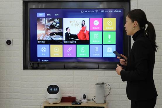 在智能家居展示区,工作人员通过语音唤醒魔飞智能麦克风,一句“我回来了”,灯光、空气加湿器、空调、电视机、智能窗帘等智能家居都进入了工作状态。通过语音还可实现对不同家居产品的独立控制、电视节目搜索、天气查询、车票机票的订购等。
